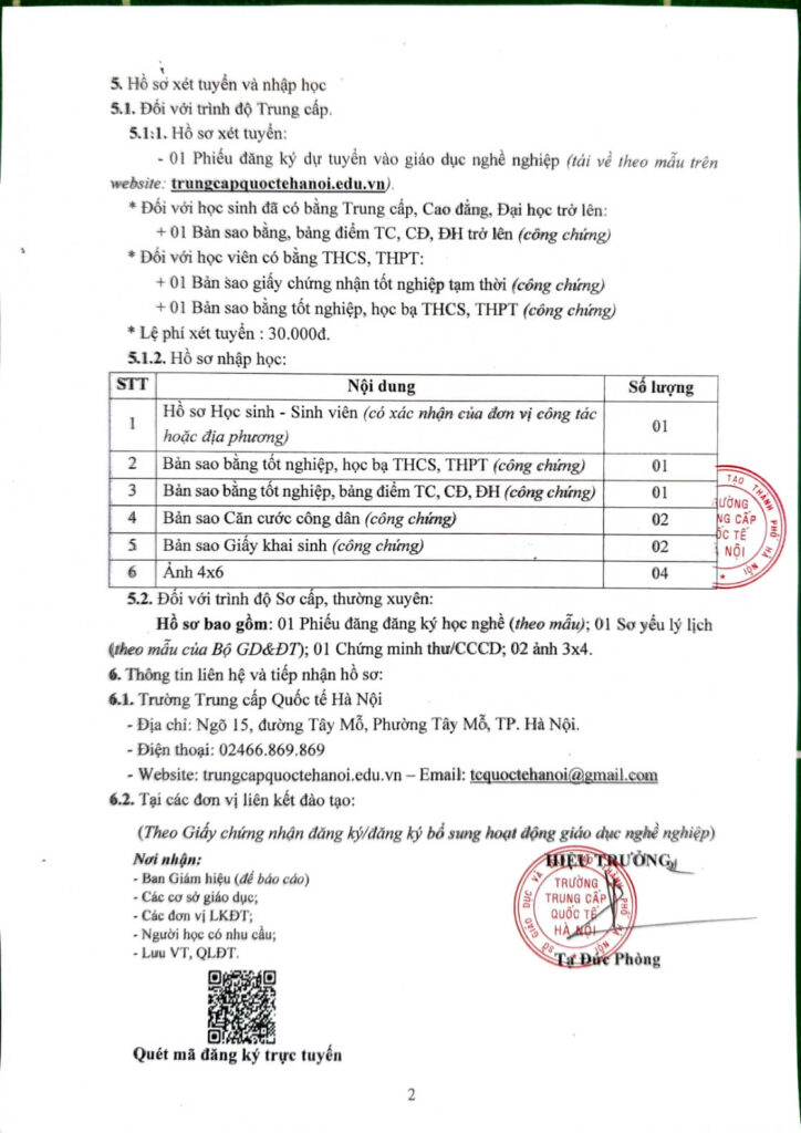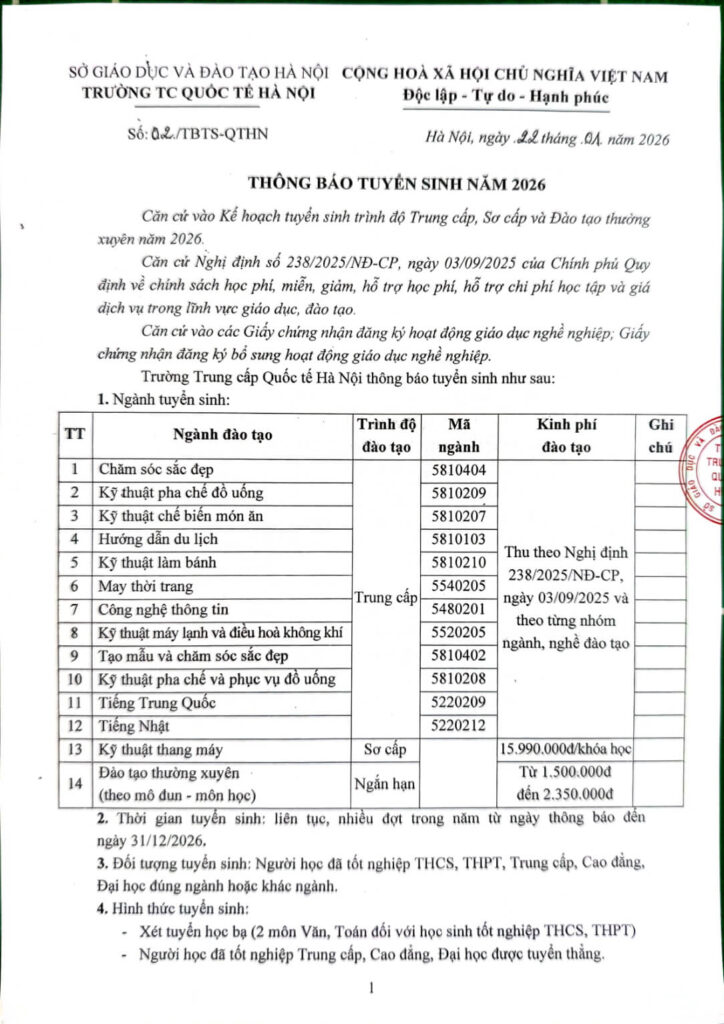 Thông báo tuyển sinh năm 2026 Trường trung cấp Quốc tế Hà Nội thông báo tuyển sinh các ngành, nghề trình độ trung cấp, sơ cấp… năm 2026